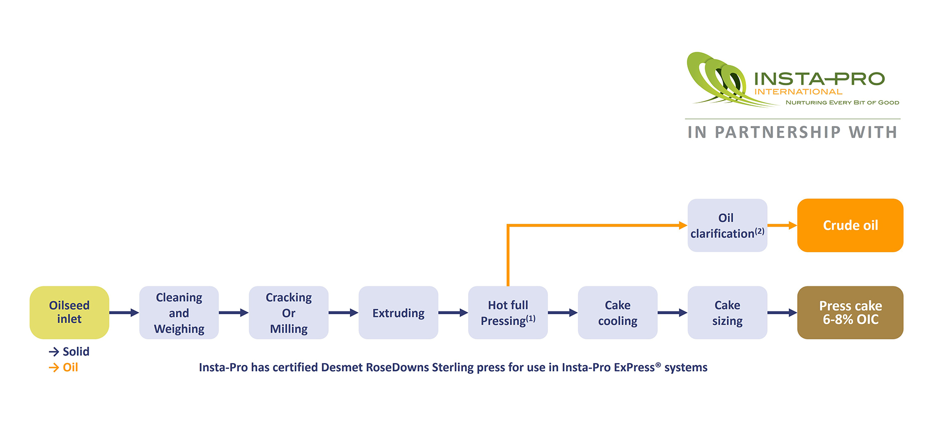 ExPress® process relies on proven equipment, including a high-shear dry extruder from Insta-Pro, screw press from RoseDowns, and vertical cooler from Stolz, specially designed to reduce anti-nutritional factor while keeping protein integrity in ExPress® soybean meal, resulting in high oil yield and enhanced protein digestibility.