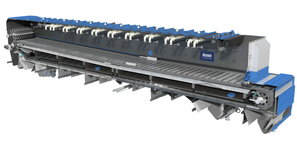 The Desmet LM-Pro extractor, a proven model in shallow configuration, features an enhanced continuous screen cleaning system. This system ensures uninterrupted operation, eliminating the need for production stoppages for screen cleaning.